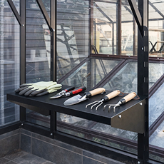 - Полки для инструментов и декоративное навершие — делают пространство функциональным и подчёркивают лаконичную архитектуру теплицы, создавая завершённый образ.